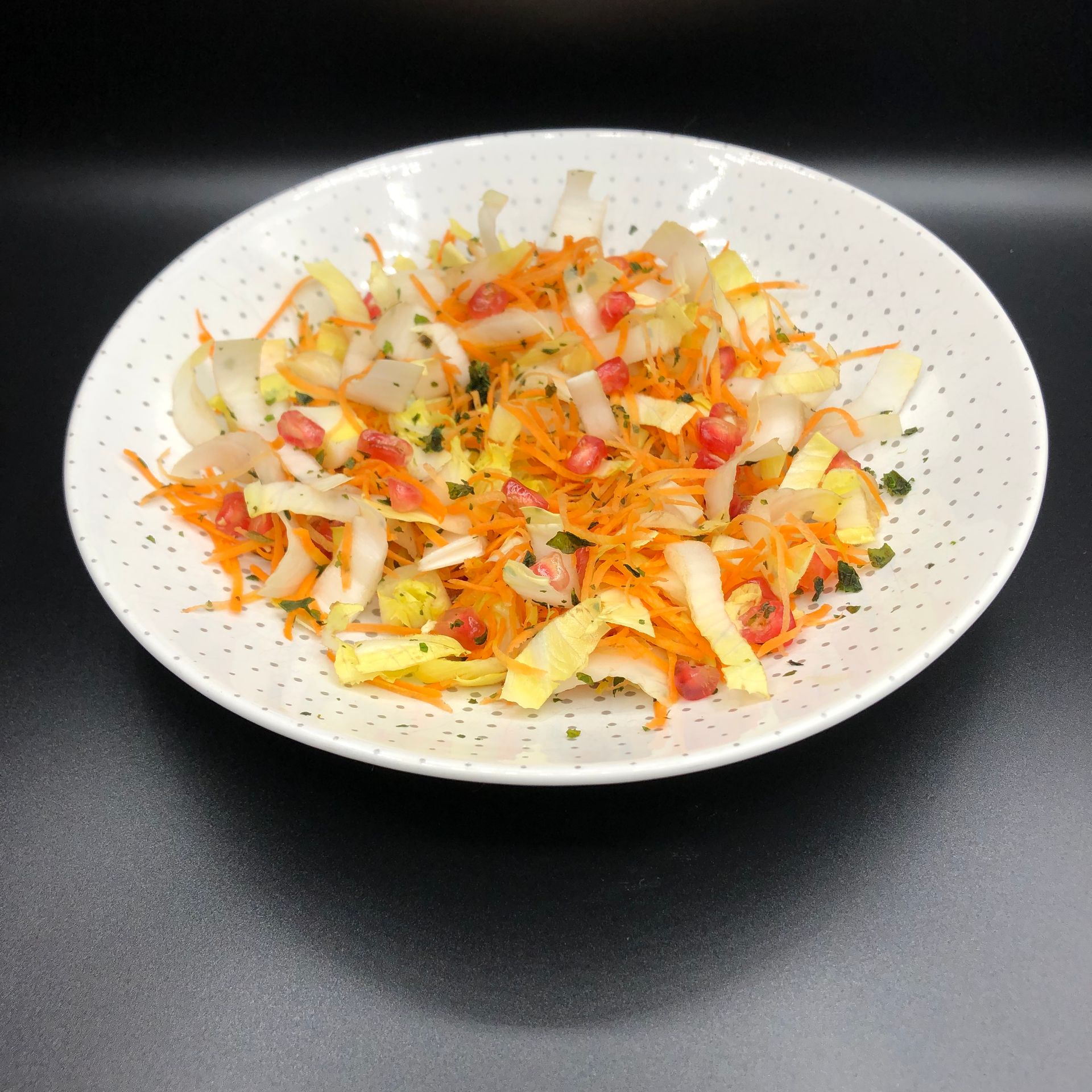 - Dans un saladier, assaisonnez-les avec l’huile d’olive, le vinaigre, le sel , le poivre, les graines de grenade, les noix et le cerfeuil ciselé.